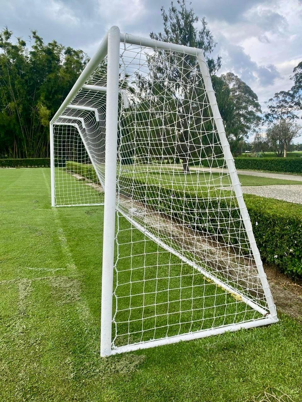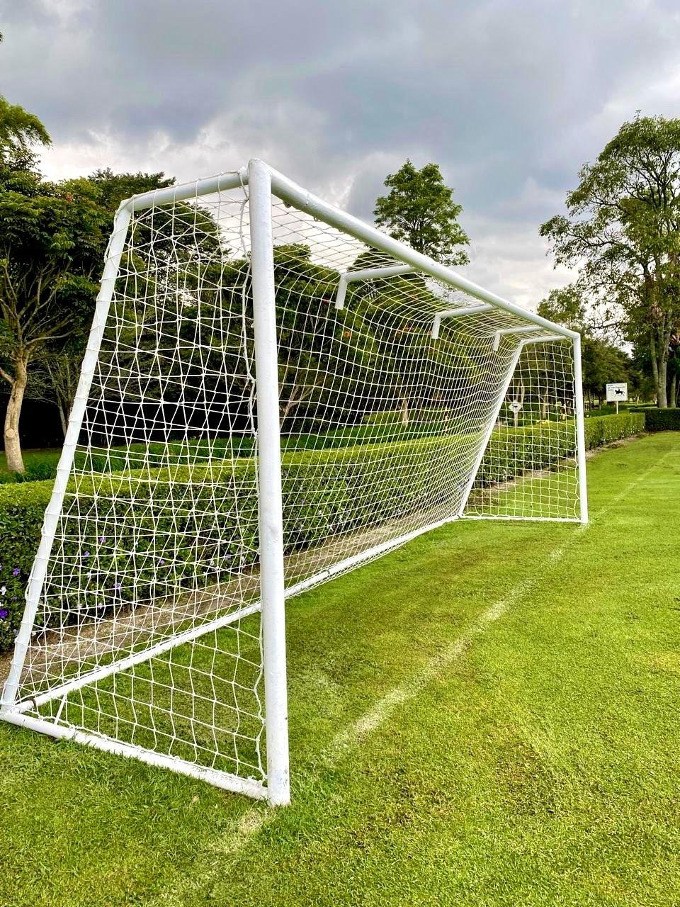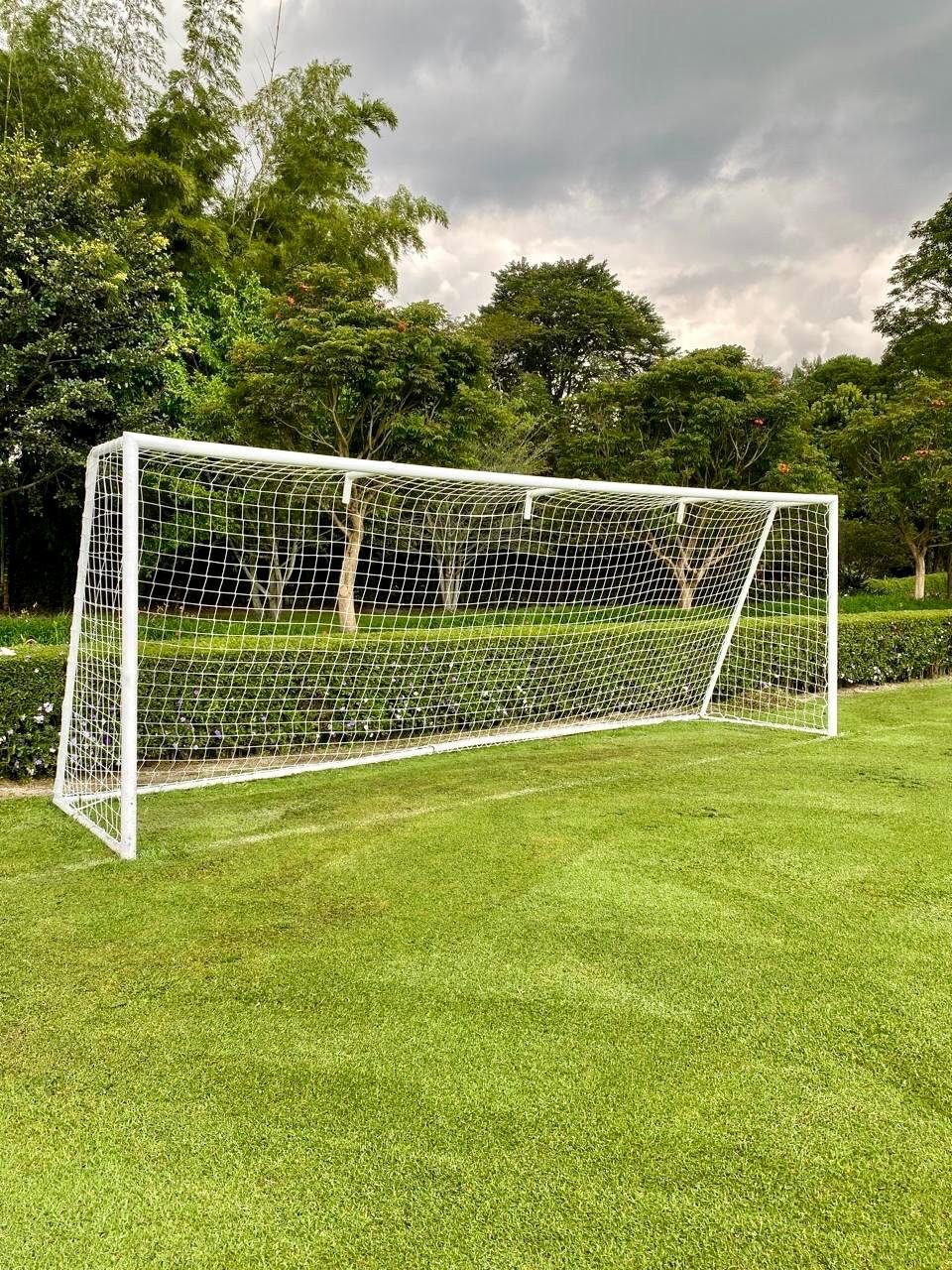 Red de nylon retorcido, tejido al cuadro con acabado impermeabilizado para máxima durabilidad a la intemperie. Fácil de instalar y alta resistencia. Incluye el Par de mallas para portería Estándar Medidas comerciales: 2m de alto x 3 m de ancho x 1 m de profundidad inferior x 0.60m profundidad superior + cordon de amarre